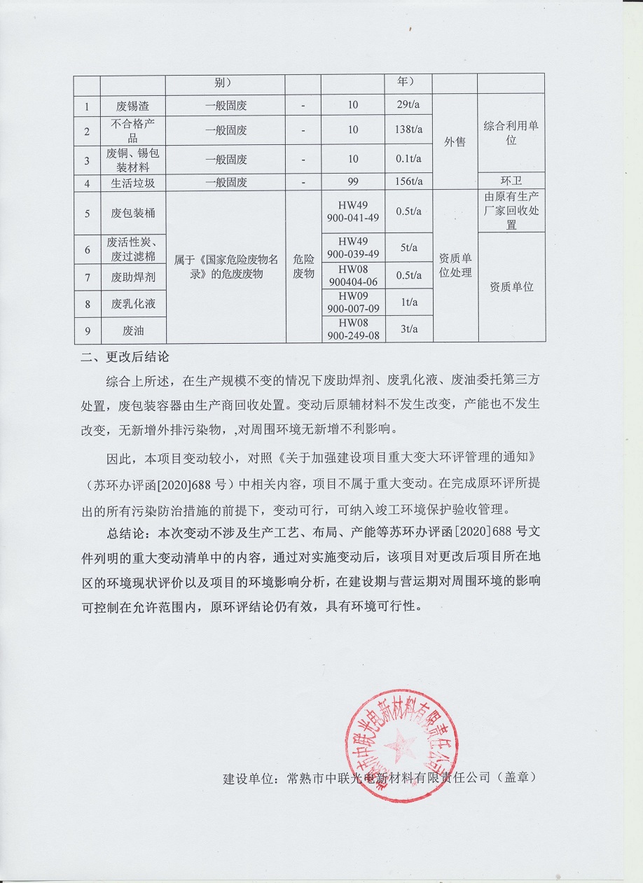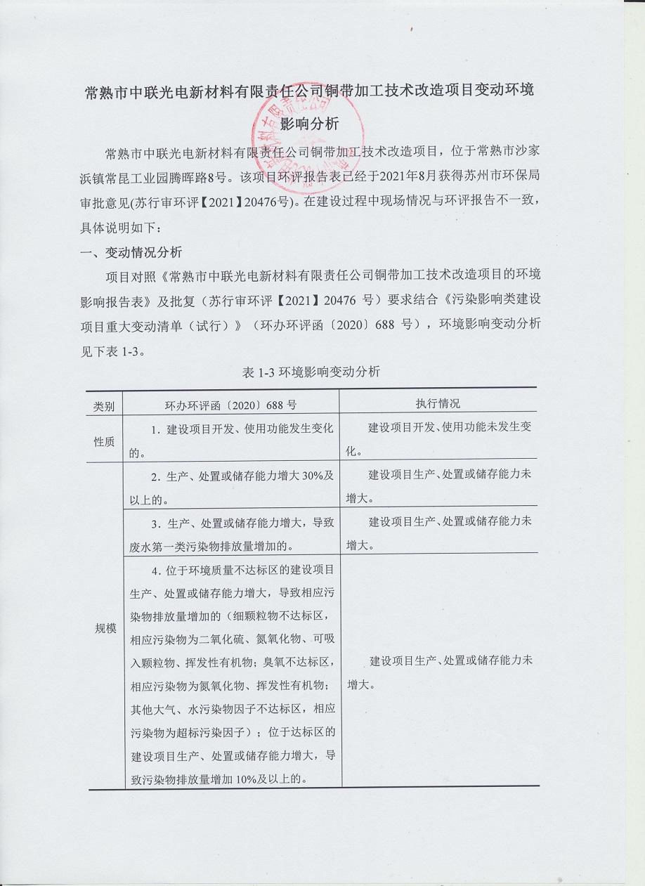 常熟市中聯(lián)光電新材料有限責任公司銅帶加工技術(shù)改造項目變動環(huán)境影響分析公示如下: