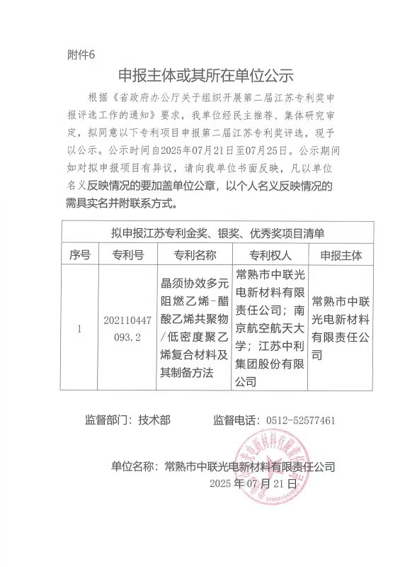 我單位經(jīng)民主推薦、集體研究審定,擬同意以下專利項(xiàng)目和專利發(fā)明人(設(shè)計(jì)人)申報(bào)第二屆江蘇專利獎(jiǎng)評(píng)選,現(xiàn)予以公示。公示時(shí)間自2025年07月21日至07月25日。